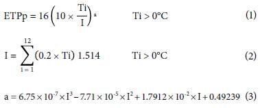 where: Ti is the mean monthly temperature (°C), I is an index that expresses the heat level of the region, and exponent "a", in function of I, is also a regional thermal index.
