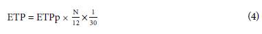 To convert ETPp to potential evapotranspiration (ETP), a correction for days of the month and photoperiod was performed. The photoperiod was calculated as a function of the site's latitude and solar declination (Eq. 4).