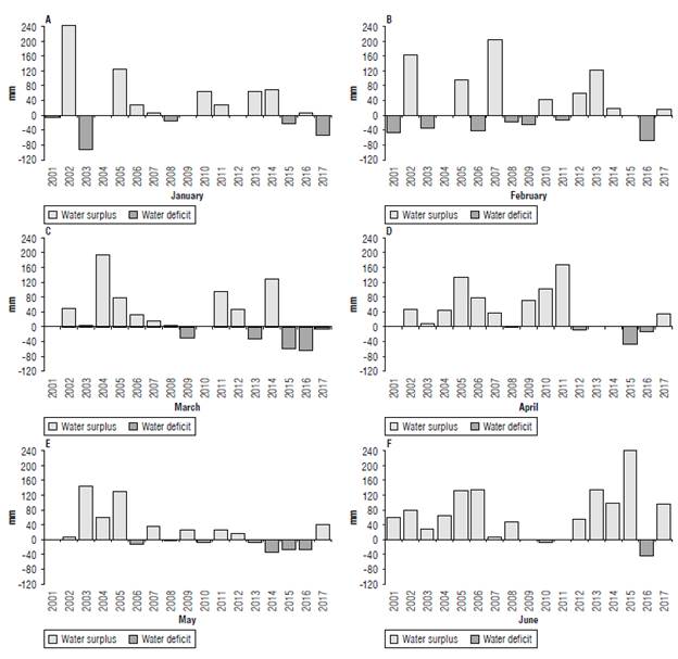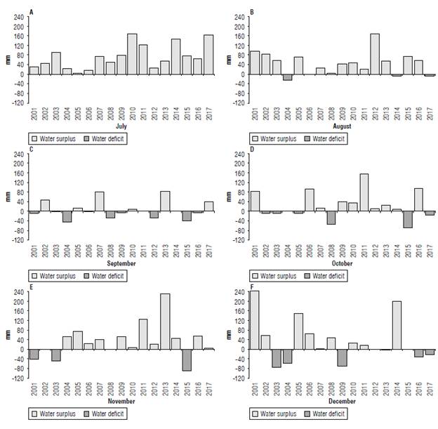All histograms exhibited periods of water deficit and surplus throughout the evaluated years (except for July), demonstrating a non-homogeneous tendency of the climate of the region. One year a month could show high water deficit, and the next it could be quite rainy. This fact stands out in February, as it showed the largest deficit between months in the mean of the years, with values of 47.0 mm (2001) and 43.5 mm (2006). In the subsequent years (2002 and 2007), this was the month that displayed the highest mean values of water surplus (166.4 and 207.5 mm, respectively).
