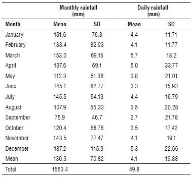 The mean values and standard deviation for monthly and daily rainfall from the CEPLAC weather station for 2001 to 2017 are presented in Table 1.