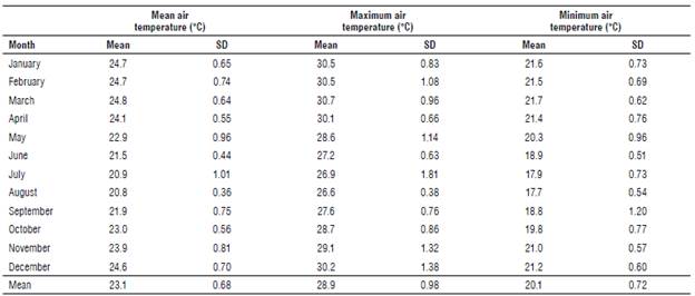 Table 2 shows the mean monthly values for mean, maximum and minimum air temperatures. The mean temperatures were below 22°C from June to September (dry season period), and August was the month with the lowest maximum and minimum temperature, - 26.6 and 17.7°C, respectively.