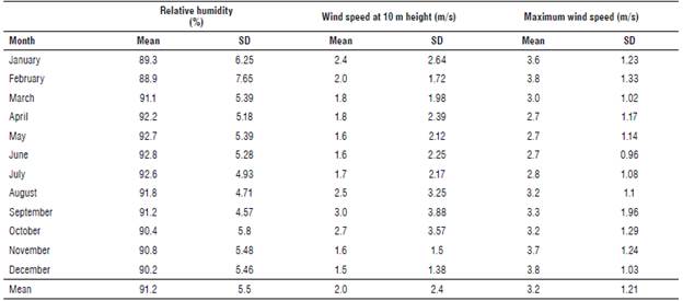 Table 3 shows the mean monthly values and standard deviation for the variables of atmospheric relative humidity, wind speed at 10 m height, and maximum wind speed. It was obvious that the atmospheric relative humidity showed little variation for the means between months. The month with the highest mean value for humidity was June (early dry season), and the one with the lowest mean value was February (mid-wet season) with values of 92.8 and 88.9%, respectively, and a difference of 3.93%.