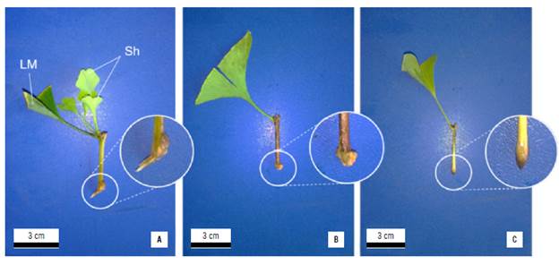 After 60 d, the following variables were evaluated: percentage of rooted mini-cuttings (mini-cuttings that emitted roots of at least 1 mm in length) (Fig. 2A), number of roots per mini-cutting, average length of three major roots per mini-cutting (cm), percentage of mini-cuttings with calluses (mini-cuttings alive, without roots, with formation of undifferentiated cell mass in the base) (Fig. 2B), percentage of live mini-cuttings (mini-cutting without calluses and without roots) (Fig. 2C), percentage of dead mini-cuttings (mini-cuttings with necrotic tissues); percentage of mini-cutting shoots (live mini-cuttings with or without roots and callus, showing shoots of new leaves) (Fig. 2A), and percentage of mini-cuttings that retained their original leaves (live mini-cuttings, with or without roots and callus, which retained the original leaves at the time of evaluation) (Fig. 2A).
