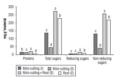 The carbohydrates translocated by phloem are non-reducing sugars such as sucrose, because they are less reactive than reducing sugars (Taiz et al, 2017). This fact can be seen in Figure 3, where it is possible to verify a decrease in the non-reducing sugar concentration at the time of mini-cutting evaluation (60 d after experimental set up). Additionally, it is possible to observe a high level of non-reducing sugars at the moment of root evaluation.