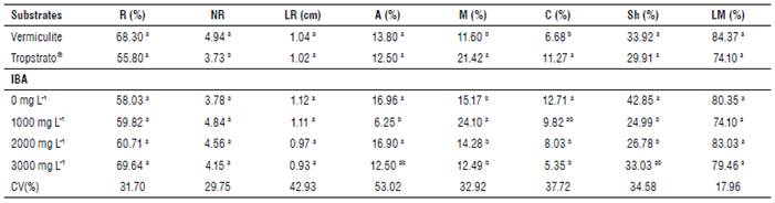 There was a significant difference between the concentrations of IBA in the percentage of shoots, with the highest percentages observed in the treatments without IBA application and in the concentration of 3000 mg L-1 (Tab. 1). According to Moubayidin et al. (2010), root growth occurs when, in the apical meristem, cell division prevails over differentiation. This occurs when there is a greater concentration of auxins promoting cell division, in contrast to the cytokinin concentrations that promote cellular differentiation.