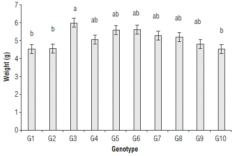 From the global analysis, significant differences in fruit weight were found among genotypes. Genotype 3 showed the highest mean value (5.99 g), and genotypes 10, 2 and 1 reported the lowest values (4.52 g), as illustrated in Figure 1.