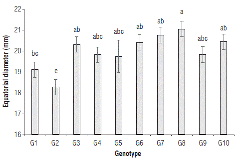 The 10 materials evaluated in the current study showed longitude values between 21.4 mm and 24.1 mm without showing significant differences. However, the equatorial diameter showed significant differences between genotype 8 and genotypes 2 and 1. Genotype 8 showed the highest value (21.07 mm), whereas genotypes 2 and 1 reported values of 18.27 and 19.11 mm, respectively (Fig. 2). The size of most of the blackberry fruits studied corresponds to the commercial categories B or C according to NTC 4106. Taking into account that all genotypes were classified as C or D for fruit weight means that these fruits are less dense or less compact than those reported in the NTC. Results found for genotype 2, which correspond to a thornless genotype, match the results described by Grijalba et al. (2010), who report that this thornless genotype is characterized by having a low fruit weight and a small size. The size of these genotypes is in the range found for blackberry varieties cultivated and commercialized in Colombia and other countries, such as Ecuador and Brazil (Hassimotto et al., 2008; Farinango, 2010). The correlation between diameters (LD and ED) was 0.53; therefore, both estimators should be taken into consideration for future studies. These two characteristics are important as they are related to the size of the fruit (Ayala et al., 2013) and both the industry and consumers have preferences for large fruits. Most people associate large size with quality, but this correlation is not completely true.