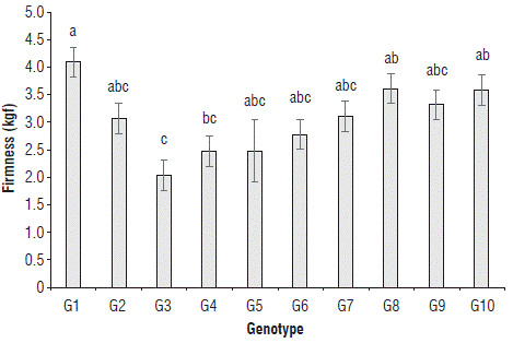 This is an important index for blackberry shelf life since it is directly related to postharvest handling potential, considering that it is necessary to remember that fruit becomes softer with ripening. Therefore, the challenge is to achieve ripe fruit with high soluble solids content, low acidity, and that are shiny and with a uniform color, a developed flavor, and enough firmness for commercial shipping and handling. Genotype 1 achieved the highest firmness value with 4.1 kgf and showed significant differences from genotypes 4 and 3, which obtained the lower values of 2.46 and 2.03 kgf. These results show that fruit firmness was lower for all the genotypes under study (Fig. 3), compared to the blackberry genotypes that García and García (2001) report. However, these were firmer than thornless genotypes such as Brazos and Navaho, reported by Perkins-Veazie et al. (2000), with values of 1.86 and 2.45 kgf; but they were also in the same range as those reported by Moreno and Deaquiz (2016) and Segantini et al. (2018).