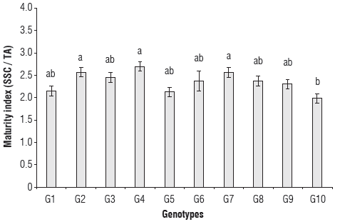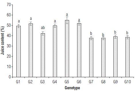 Juice content reported significant differences among the genotypes (Fig. 4). Genotypes 1, 2, 4, 5 and 6 achieved the highest juice content compared to genotype 9, 10, 7 and 8 that showed the lowest values.