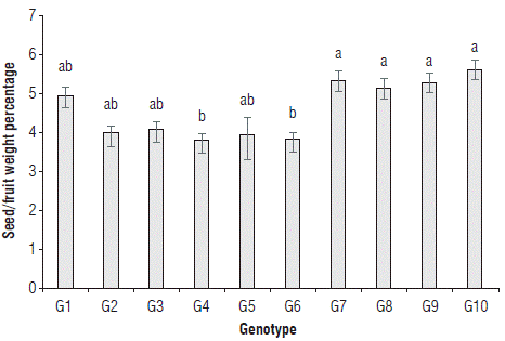 Genotypes 8 and 7 reached the highest value (51%) for pulp content, while genotypes 6 and 5 reported the lowest value. However, before recommending any genotype, it is important to point out that genotypes 6 and 4 showed the lowest seed/fruit weight percentage (3.85%) and these genotypes showed markedly significant differences with genotypes 10 (5.64%) and genotypes 7, 9 and 8 (5.3%) (Fig. 5). This characteristic relating to low seed perception is critical for both fresh and processed berries (Clark and Finn, 2011).