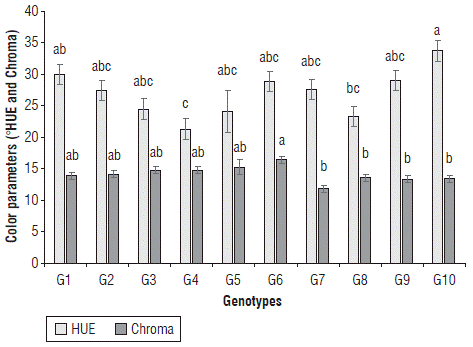 Fruit ripening and color of blackberry fruits are associated with better customer acceptance. Consumers look for fully dark but shiny red-purple drupelets, but not completely red as this means unripe fruit. Based on the results, it can be proposed that the color of all genotypes corresponds to a red color but with different grades of saturation. Figure 6 shows that genotype 4 had significant differences compared to genotype 10, highlighting its stronger red-purple color according to the HUE angle values found. This color is related to the presence of anthocyanins and according to these results it seems that genotype 4 shows a higher anthocyanin content (Zielinski et al., 2015).