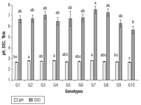 The highest pH values (2.8) were observed in genotypes 7, 4, and 2 establishing markedly significant differences from genotypes 9, 1, and 10 (Fig. 7). The pH parameter showed important differences among genotypes and can be considered a good indicator. Nevertheless, pH values found in all the genotypes were lower than those reported for genotypes Ouachita (3.2), Natchez (3.1), Navaho (3.2), and Osage (3.6) (Perkins-Veazie et al., 2000; Clark et al., 2019).