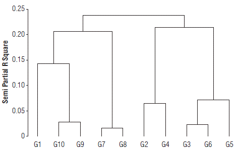 Figure 9 shows a dendrogram with the classification of these 10 genotypes in the dendrogram (Fig. 9), five groups were formed by cluster analysis.