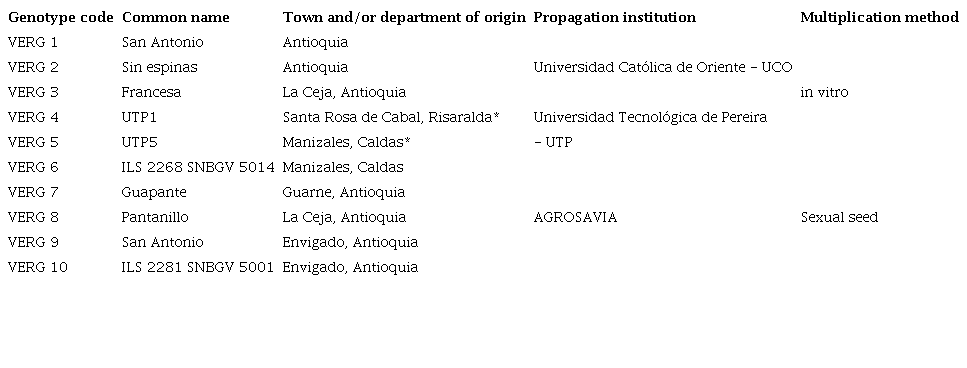 Blackberry (Rubus glaucus Benth.) plants of 10 genotypes were maintained in field plots in Silvania, Cundinamarca. These plants were established in performance plots for the project "Selected, identified and registered blackberry cultivars for commercial certification" included in the macro-project "Integrated development of sustainable production models for the cultivation of blackberry in Colombia". These genotypes were sown in rows spaced every 3 m in a completely randomized block design with four replicates per genotype with 10 fruits per block and genotype. Blackberry fruits of these ten genotypes were selected because of their interesting fruit quality traits, which were evaluated in three harvest dates throughout 2016 during the dry and rainy periods (Tab. 1).