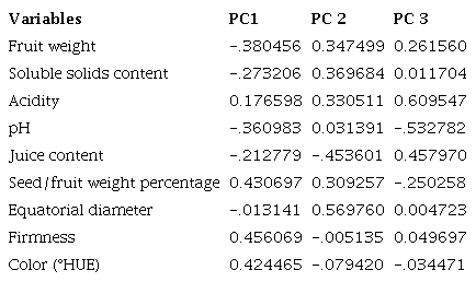 To classify the ten assessed genotypes into homogeneous groups based on the variables fruit weight, soluble solids content, acidity, pH, juice content, seed/fruit weight percentage, equatorial diameter, firmness, and color (°HUE), we performed a principal component analysis (PCA). The first three components explained 81.62% of the total data variability. The first component reported 39.76% whereas the second one showed 26.68% and the third one 15.18%. Moreover, the first component was associated with the variables seed/fruit weight percentage, firmness, and color (°HUE); the second component was related to the equatorial diameter, and finally, the third component was related to pH and acidity, as seen in Table 2.