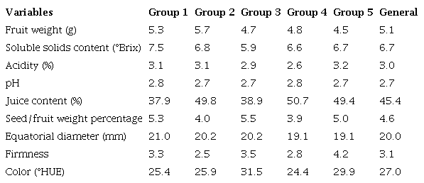 Group 1, consisting of two genotypes (G7 and G8), is characterized as the group with the highest mean soluble solids content value (°Brix) (7.5), compared with the other groups. Fruit weight, acidity, pH, seed/fruit weight percentage, equatorial diameter and firmness were higher than the general mean of all the genotypes.