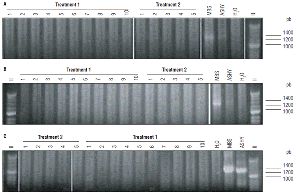 To determine phytoplasma ribosomal group affiliation, nested PCR amplifications were performed with the R16F2n/R16R2 primers at a final volume of 30µl. This volume was divided into four, and each aliquot digested with the restriction endonucleases Rsal, Msel, fihal or AluI (New Englad BioLabs). Digestions were conducted at a final volume of 20µl, with 0.05 U of enzyme, 1X buffer and 6.5µl of the PCR product obtained by nested amplification. The reactions were incubated at 37°C overnight. The restriction products were separated using agarose gel electrophoresis at 3% in TBE buffer. Additionally, the selected amplicons obtained with the primers R16F2n/R16R2 were purified with the UltraClean® PCR Clean-up Kit (Mo Bio Laboratories, Inc.) and sequenced bidirectionally in Macrogen, Korea. The sequence analysis was performed as explained before.