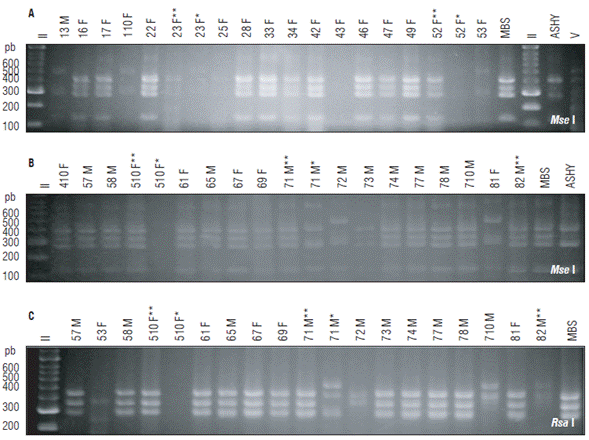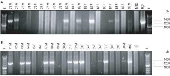 The PCR reactions for phytoplasmas were made as explained before. For F. x ananassa, 1:20, 1:50 and 1:100 dilutions of the DNA extracts were tested. For the insects, 1:20 dilutions of DNA extracts were analyzed. The PCR with universal primers P1A/P7A (Lee et al., 2004) produced amplicons of ~1800 bp, which were diluted 1:20 and used in nested PCRs with the internal primers R16mF2/ R16mR1 (Gundersen and Lee, 1996) to obtain ~1430 bp amplicons. Frequently, when low intensity amplicon bands were observed in nested PCRs, the resulting amplicons were amplified again using internal primers R16F2n/ R16R2 (Gundersen and Lee, 1996) using 1:20 dilutions of the amplicon as template. Bands with enough DNA were further analyzed by sequencing or RFLP analyses. In these reactions, the positive control corresponded to fragments of the region 16S-23S of the phytoplasmas Maize bushy stunt - MBS (16SrI-B group) and ash yellows ASHY (16SrVII-A group), previously cloned and maintained in an Escherichia coli strain. In the F. x ananassa plants and in the A. funzaensis, additional nested PCRs tests were performed with different primer combinations such as P1A/P7A (Lee et al, 2004) followed by R16F2n/R16R2, and R16mF2/R16mR1 in primary reactions followed by R16F2n/R16R2. The plant DNA extracts were analyzed in 1:50 and 1:100 dilutions and the insect DNA extracts in 1:10 dilutions. The thermic profile was as described before, except for annealing temperatures that depended on the primer pairs used: P1A/P7A, 55°C; R16mF2/R16mR1, 54°C and R16F2n/R16R2, 54°C. The amplicons were separated using standard electrophoresis in 1% agarose gels in TBE buffer 1X (89 mM Tris base, 89 mM boric acid, 2 mM EDTA), stained with ethidium bromide and visualized under UV light.