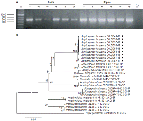 Amplicons of the mitochondrial DNA COI gene were obtained from 12 individuals, six collected at the UMNG and six at the UN. Consensus sequences of lengths between 667 and 706 bp were obtained from nine individuals (Fig. 5A); the other sequences were illegible. The edited sequences were uploaded in the BOLD database (http://v3.boldsystems.org/) (Ratnasingham and Hebert, 2007). The sequences of all the A. funzaensis collected in Bogota at the UN showed a conserved haplotype (Sequences ID: COLCI053-18, COLCI054-18, COLCI055-18, COLCI056-18, and COLCI057-18), but the ones collected at the UMNG in Cajica represented three haplotypes. Haplotype 1 was identical to the Bogota sequence (Sequence ID: COL-CI049-18); two sequences called haplotype 2 (Sequences ID: COLCI051-18 and COLCI052-18) presented substitutions T by C at positions 183, A by G in 453 and T by C in 517. In 99%. Sequences for A. funzaensis were not found in the haplotype 3, there was a substitution of G by A in position BOLD or GenBank databases, therefore, Deltocephalinae 342 (Sequence ID: COLCI050-18). The sequence similarity sequences showing similarities between 86% and 87% were of the COI sequences obtained for A. funzaensis was over used for comparison.