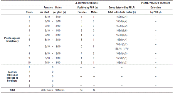 At the time of this experiment it was not possible to raise A. funzaensis under laboratory conditions, so the transmission experiment was performed with insects from a naturally infected population. In a previous work, a population of A. funzaensis infected with 16SrI and 16SrVII phytoplasmas had been found, but before performing the experiment it was tested again for the presence of phytoplasmas. Twelve adults of twenty A. funzaensis from that population were found positive for phytoplasmas by nested PCR, but no further RFLP or sequencing analysis were performed because the quantity of the obtained DNA was too small.
