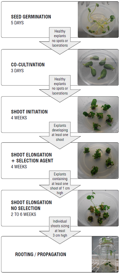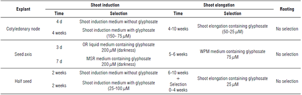 Once the designed expression cassette is synthetized according to the instructions given in the preceding paragraph, it must be introduced into A. tumefaciens. The recombinant strain can be maintained on a Luria-Bertani (LB) medium (50 mg L-1 kanamycin). A hypervirulent strain of A. tumefaciens, ATCC53213, carrying a pMON546 vector with a petunia epsps gene has been described by Kishore and Shah (1988) and Shah et al. (1986) in the patent US4971908A (application April 22, 1988, and expired status) and the patent US4940835A (application July 7,1986, and expired status), respectively. Agrobacterium strains must be characterized using PCR: i) Ach5FtsZ primers (F: 5'-GAACTTACAGGCGGGCTGGGT-3', R: 5'-CGC-CGTCTTCAGGGCACTTTCA-3', product: 369 pb) are specific to A. tumefaciens LBA4404; ii) C58GlyA primers (F: 5'-CCACCACCACGACGCACAAGTCT-3', R: 5'- TGC- CGAGACGGACACCCGAC-3', product: 423 pb) are useful for the detection of C58C1, EHA101, EHA105, and GV3101 strains; iii) pTiBo542 primers (5'- CCCGCTGAGAAT- GACGCCAA-3', R: 5'- CCTGCGACACATCGTTGCT- GA-3', product: 766 pb) are specific to EHA101 and EHA105 (differentiated from C58C1, LBA4404 and GV3101 strains), and iv) nptI primers (F: 5'- CTGCGATTCCGACTCGTC-CA -3', R: 5'- CGGGCAATCAGGTGCGACA-3', product: 572 pb) are special for EHA101 only (Deeba et al., 2014). In our experience, A. tumefaciens strains EHA101 and EHA105 are useful for soybean transformation, probably because of their virulence. We tested another bacterium, Sinorhizobium meliloti (see https://cambia.org/), to see if we could recreate the soybean infection; however, the results were not encouraging. Agrobacterium cultures (OD650 = 0.6-1.0 at 28°C, 250 rpm) must be used for infection of explants (Guo et al., 2020). A bacterial pellet obtained by culture spinning (8000 rpm, 4 min) must be resuspended in cocultivation media (1X Gamborg vitamins, 0.1X B5 salts, 1.67 mg L-1 BAP, 0.25 mg L-1 GA3, 3% sucrose, 20 mM MES, 200 μM acetosyringone, pH 5.7).