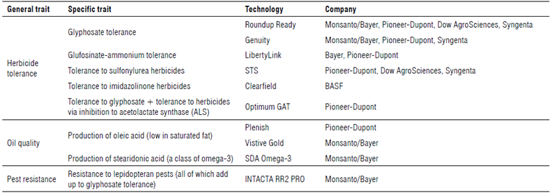 The adoption of GM herbicide tolerant crops has positive impacts on agriculture, such as an increase in weed control to herbicide management, compared to traditional systems. These GM crops support crop management with a reduction of the impact on the environment and human health due to a lower use of herbicides in the post-emergent phase with beneficial effects on the soil ecosystem. GM crops also favor the adoption of agricultural conservation practices such as the minimum tillage system that reduces soil erosion, improving water quality and soil degradation (Owen, 2010; Green, 2012). Glyphosate is an herbicide widely used; it is of slow action, a fact that facilitates its translocation from leaves to meristematic tissues and makes it environmentally safe. Glyphosate shows slow mobility in the soil, which reduces the likelihood of contamination of local waterbodies, and a relatively short half-life in the soil. Prior to the introduction of GM crops exhibiting tolerance to glyphosate, this herbicide could only be used in areas where no plant growth is desirable, or with methods avoiding contact with commercial crops. This way, GM crops opened up the possibility for direct use by farmers (Duke & Cerdeira, 2010). GM glyphosate-tolerant soybeans simplify weed management. The farmer may control weeds with just a few applications (one or two) of herbicide during the growth cycle instead of using complicated strategies that include different herbicides incorporated into the soil and/or foliar application. The herbicide could only be applied when there is the presence of weeds because of its post-emergent action, promoting the limited use of these kind of products (using less toxic alternatives). Plowing can be reduced or even eliminated, which lowers expenditure on fossil fuels or equipment with a significant reduction in CO2 emissions and soil disturbance (Green, 2012).