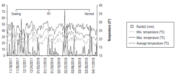 The experiment was carried out from November 2017 to April 2018, the rainy season in the Midwest region of Brazil (Fig. 1), with no water restriction during the entire cycle of the soybean cultivars under study. Regarding plant nutrition, fertilization was carried out in line with the soil analysis (Tab. 1). Therefore, no symptoms of nutrient deficiency or toxicity were observed in the three studied soybean cultivars.