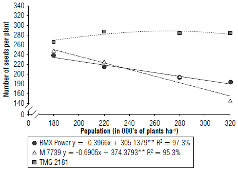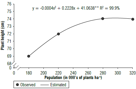 SD was affected by plant population, and a linear decrease in the average values was observed as plant population increased, with values that ranged from 8.82 mm in a population of 180,000 to 7.84 mm in a population of 320,000 plants ha-1 (data not shown). A distinct trend was observed for PH, in which the diameter values decreased in a linear manner, while plant height increased.