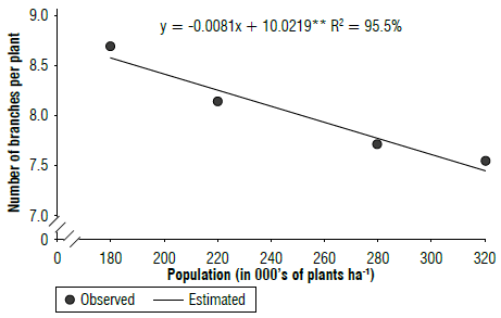 The phenotypic trend displayed by the genetic materials in this study was significant and a decreased number of branches per plant was easily observed according to the concentration of plants ha-1, mainly when the cultivar BMX Power IPRO was used (Fig. 4).