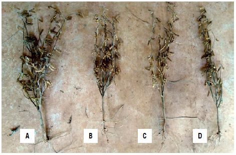 Manual harvest of the useful area began on 04/01/2018, when the plants reached stage R8, with 95% of the pods in brown color, which indicated ripeness. At first, 10 plants were collected in the useful area of each plot for evaluation of the following characteristics: plant height (PH) - measured in cm between the stalk of the plant and the apical edge of the main stem of the plant, using a measuring tape; stem diameter (SD) - diameter of the stalk, using a digital caliper with an accuracy of 0.01 mm, about 2 cm above the soil; number of branches per plant (NBP) - counting the average number of branches in the plant; number of pods per plant (NPP) - calculating the overall mean of pods in the plants; number of seeds per plant (NSP) - counting the seeds formed in the plants; number of seeds per pod (NSPP) - calculating the ratio between the number of seeds per plant and the number of pods per plant; weight of 100 seeds (W100S) - using random samples of 100 seeds. In addition, the seed yield (SY) was computed through an evaluation of the mass of the seeds originated from all the plants collected in the useful area of the plot, weighed using a precision scale of 0.001 g (model TP 200S, OHAUS Corporation, USA), expressed in kg ha-1 and corrected to 12% of moisture content (wet base).