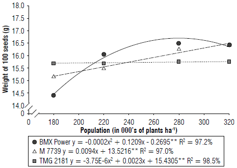The indeterminate cultivar BMX Power IPRO showed an increase in W100S in plant populations of 280,000 plants ha-1 (Fig. 6), followed by the decrease observed in larger studied populations. Seed weight is relevant for its ability to generate more vigorous seedlings during the germination process. This is explained in the physiological quality of seeds section.