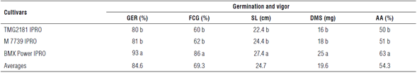 The seed vigor data (Tab. 4) showed that the average obtained had a similar trend to that described in the germination test, in which the indeterminate cultivar BMX Power IPRO stood out from the others in all the evaluations. Then, it can be concluded that this cultivar has the potential to produce seeds with a homogenous and faster germination, with more vigorous seedlings.