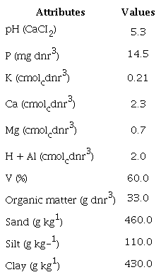 The experiment was carried out during the 2017/2018 agricultural harvest at the experimental facility of Agência Goiana de Assistência Técnica, Extensão Rural e Pesquisa Agropecuária (EMATER), Anápolis-GO, Brazil, at an average altitude of 1050 m a.s.l. Soil samples, classified as Red-Yellow Latosol (Embrapa, 2013), were collected at the crop location, from the 0-20 cm layer, and sent to the laboratory of the experimental facility for physico-chemical analysis (Tab. 1).
