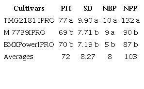The average data of NBP differed among the genetic materials studied, given that the determinate cultivar TMG 2181 IPRO produced more branches per plant, but without differences when compared to the semi-determinate M 7739 IPRO. Recent studies (Souza et al., 2016) support the findings of this research that determinate soybean cultivars produce a greater mean of branches per plant since cultivars TMG 2181 IPRO and M 7739 IPRO produced equally a greater number of branches per plant.