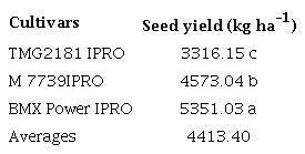 The three cultivars are characterized as highly producing cultivars based on the final yield, with the indeterminate cultivar BMX Power IPRO standing out from the other two with the highest average (89 bags ha-1), followed by the semi-determinate M 7739 IPRO (76 bags ha-1) and the determinate TMG2181 IPRO (55 bags ha-1).