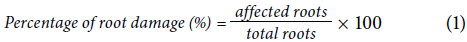 The damage caused by symphylids was quantified for each plant and measured as a percentage of affected roots. The affected root was estimated by the apex damage and subsequent bifurcation (Fig. ID). This damage has been reported to be exclusively caused by symphylids (Agredo et al., 1988; Soler et al., 2011). Although it would have been desirable to evaluate a higher number of roots for this study, the number of roots per plant was low and only 10 were measured. The percentage of damage per sampling point was estimated using Equation 1: