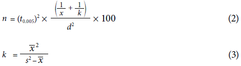 where n represents the necessary number of samples to estimate the symphylid density population in each farm and at each sampling time; t is the aggregation coefficient for a population that has a binomial distribution; t0.05 is the t-student distribution value, and d the acceptable deviation from the population mean which in this case is 0.25, that is 25%. This analysis was performed only on farms with 10 or more samples of the same variety/hybrid.