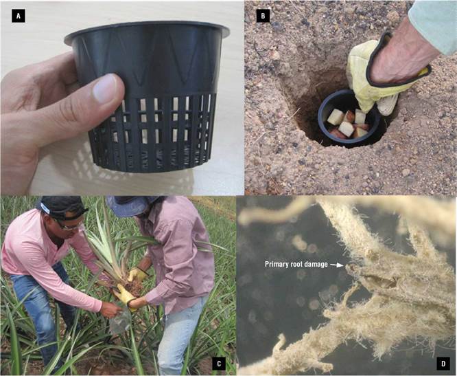 Symphylids have an aggregate distribution (Soler et al., 2011). Therefore, locating their colonies within the crop would be the first step for their management. This activity is difficult because the symptoms caused by their damage, such as growth retardation and the reddish coloration of leaves, can also be confused with the damage of mealybugs (Agredo et al., 1988; García Reyes, 1994). Symphylid monitoring has been mainly based on uprooting pineapple plants and observing their presence in the soil and roots (Morales Granados & López González, 2002). This destructive method can be inaccurate and difficult to standardize, making it hard to use as a decision tool. A new sampling methodology based on traps with a bait of potato pieces and soil has shown to be efficient and easy to use (Soler et al., 2011). However, its benefits have been neither evaluated nor compared with the traditional sampling methodology, nor has this method been related to the damage of symphylids in pineapple roots.