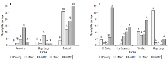 In general terms, symphylid abundance increased from planting to the end of the establishment of the crop eight months later (Fig. 2). The differences between farms in terms of the variations in the populations of symphylids were notable (Fig. 2). The context: slope level, resources, and farmer experience of each farm determined differences in the management practices that most affected the symphylids, such as plowing and pest management. A better understanding of the variations in their populations could be achieved if each farm were analyzed independently.