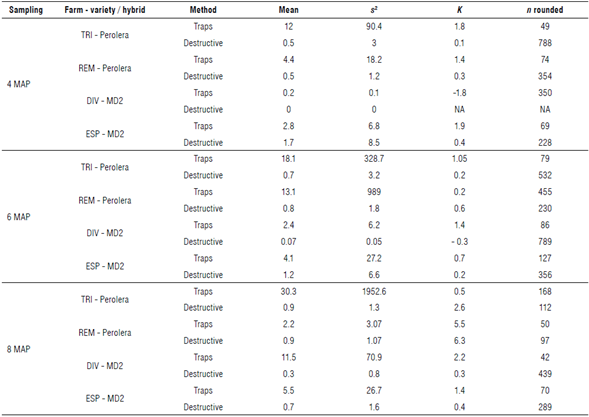 Due to the greater susceptibility of the roots of seedlings at early stages of development, symphylid management practices should begin before land preparation. Sampling with baited traps would be useful to detect colonies of symphy-lids that can remain constant from year to year with little lateral displacement (Gerdeman & Diehl, 2021). To estimate the population density of symphylids, Gerdeman and Diehl (2021) recommend a sampling of at least 50 baited traps depending on the size of the lot and the time of year, but they do not recommend a specific number of traps ha-1. In our case, in most of the evaluations, an adequate estimate would be reached (except for some farms with more variability) with 75 well distributed samples. This could be an adequate minimum of samples in pineapple crops of 1 ha. Once the colonies are detected, control strategies can be targeted, reducing costs and pesticide applications.