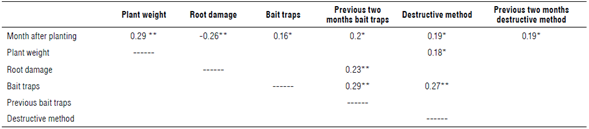 The correlation matrix shows that root damage is related to sampling with bait traps and not to the destructive method (Tab. 3). The previous reading of symphylids with traps two months before was decisive in the percentage of damage. This may indicate that part of the damage registered was old damage that occurred several weeks before. Roots that are no longer functional because of symphylid attacks may take several weeks to decompose. Therefore, the registry of symphylids that is carried out at a certain moment will serve more to predict future damage to the roots than to infer current damage.