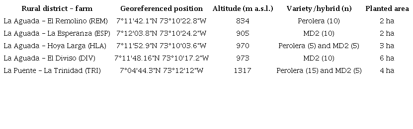 The department of Santander has the highest pineapple production in Colombia, with 11,444 ha planted and a yield per area below the national average (Ministerio de Agricultura y Desarrollo Rural, 2017). Two pineapple materials predominate, the traditional variety Perolera and the hybrid MD2, also called "Oro miel". The latter has increased in planted area in recent years and has a higher market price. However, the variety Perolera is widely accepted by farmers, has a market for agribusiness, and a higher tolerance to pests and diseases, according to growers. Although, there is information about arthropods associated with the variety Perolera (Morales Granados & López González, 2002), little is known about the susceptibility of the hybrid MD2 to pest arthropods due to its relatively short introduction.