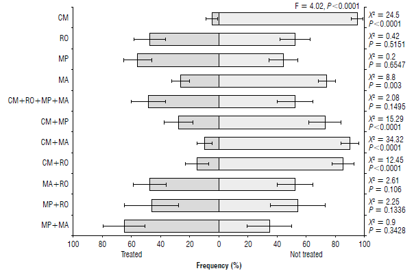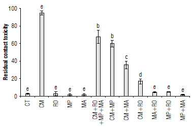 The residual contact toxicity of essential oils and their mixtures against adult females of T. urticae is shown in Figure 1. The essential oil C. myrrha exhibited 95% mortality (F11,48 = 119.12; P<0.001), and the mixtures R. officinalis + M. piperita + M. alternifolia + C. myrrha, C. myrrha + M. piperita, and C. myrrha + M. alternifolia showed 68%, 60% and 36% (F11,48 = 119.12; P<0.001).