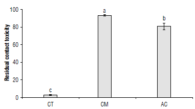 The essential oil of C. myrrha showed 93% toxicity against adult females of T. urticae in protected cultivation, whereas the fenpyroximate showed 80% toxicity (F2, 8 = 545.24; P<0.001) (Fig. 3).