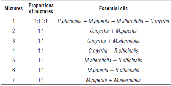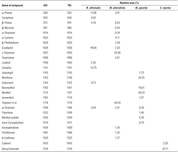 In the gas chromatography analysis with flame ionization detector (GC/FID), eight constituents were identified in the essential oil of R. officinalis, in which eucalyptol (49.66%), α-Pinene (17.08%) and camphor (14.79%) were the main ones. Fourteen constituents were identified in the essential oil of M. alternifolia, with terpinen-4-ol (48.93%) and Y-Terpinene (20.88%) being the main ones. Nine constituents were found in the essential oil of M. piperita, in which menthol (48.53%) and menthone (24.25%) were the main ones. Two constituents were identified in the essential oil of C. myrrha, with benzyl benzoate (97.71%) being the main one (Tab. 2).