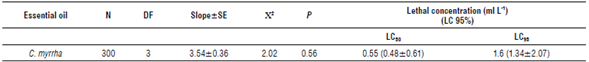 The lethal concentration of the essential oil of C. myrrha showed an LC95 of 1.6 ml L-1 and an LC50 of 0.55 ml L-1 (Tab. 3).