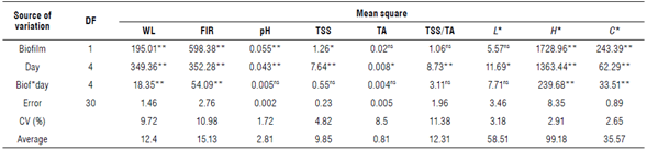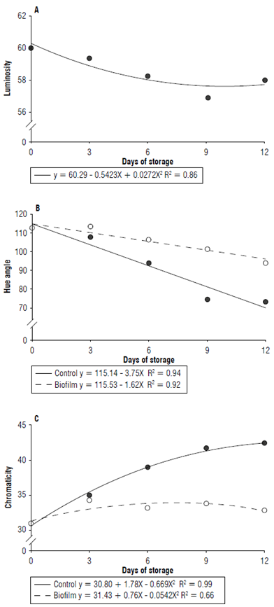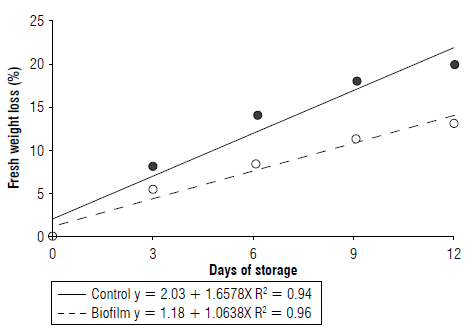 Data were subjected to an analysis of variance. The means for the qualitative data (with and without the biofilm) were compared using the F-test (P<0.05). Quantitative data (storage days) were subjected to a regression analysis using the Sisvar statistical software (Ferreira, 2014). The figures were made using the SigmaPlot version 11.0 (Systat Software, San Jose, CA, USA).