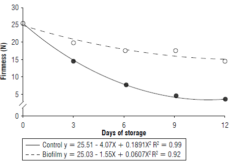 FIR decreased with storage days and became stable after 9 d (Fig. 2). The FIR of the fruits treated with 1% cassava starch bio film was 67.66% greater than the untreated fruits. Fruits not treated with biofilm obtained FIR values of approximately 5 N on the 9th d of storage that show a high degree of maturation and the beginning of deterioration. In contrast, fruits with biofilm showed FIR of approximately 15 N, with a good appearance and remaining suitable for consumption until the last day of evaluation.