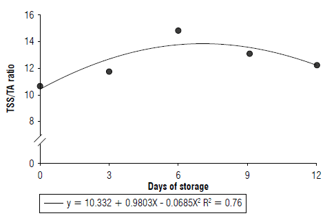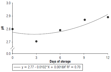 The fruit pH increased 4.33% up to the last day of storage; the increase was more marked after the 6th d (Fig. 3). Fruits treated with cassava starch had a pH 3% lower than those not treated (Tab. 2).