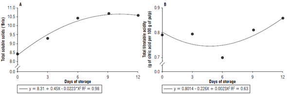 The TSS had a significant increase of 25.5%, from 8.4 to 10.57 °Brix during storage, decreasing after the 10th d (Fig. 4A). On the other hand, the TSS showed values 4% lower when the bio film was used. The lower concentration of TSS is due to the delay in fruit ripening provided by the biofilm that reduces the synthesis of sugars.